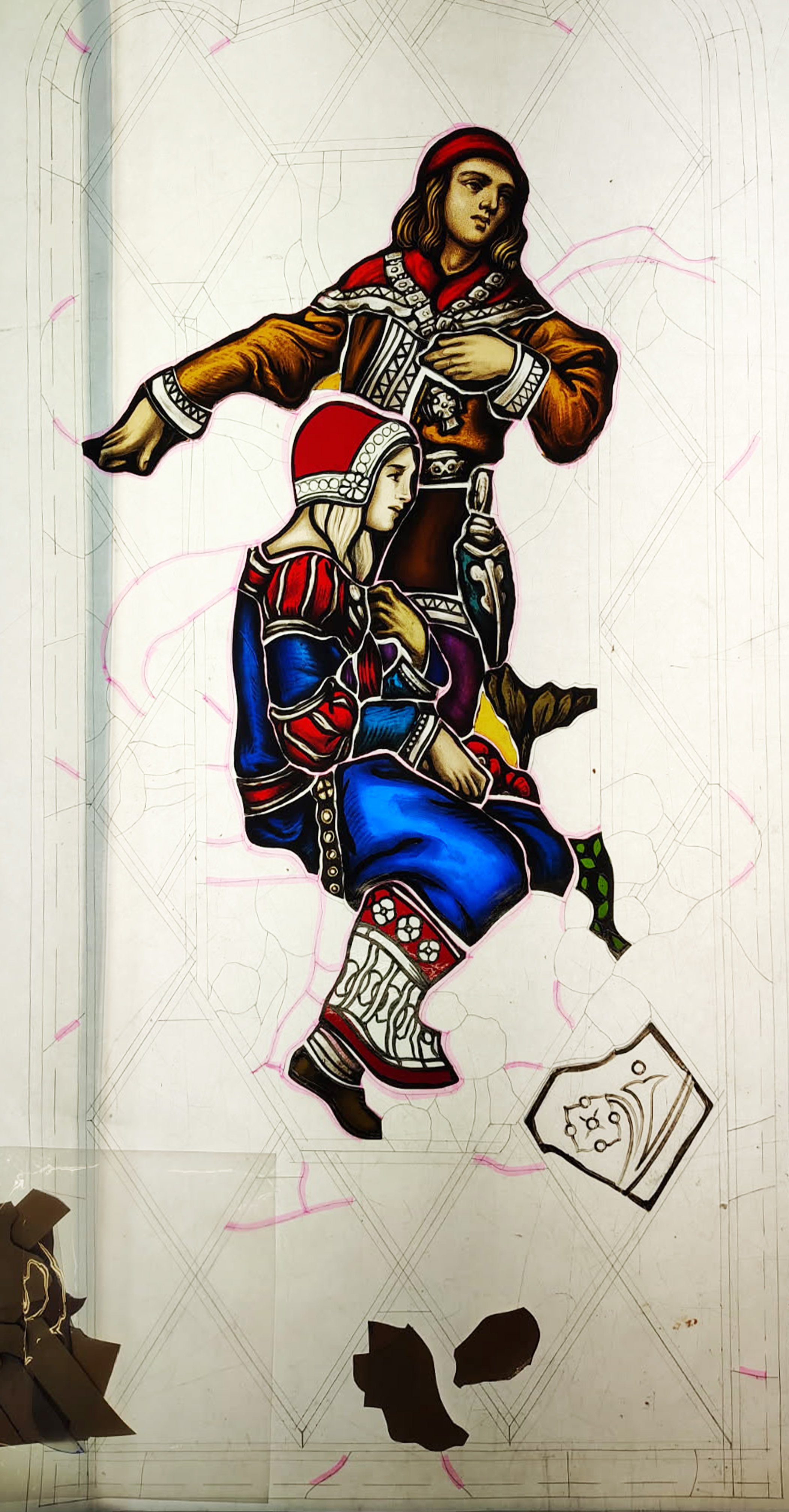 To begin the work, our team was supplied with two boxes, a bucket of glass, and what was left of the windows. Bill Matt, Executive Director of Meadow Brook Hall described it well for CBS Detroit: There were thousands of shards of glass. They had to painstakingly sort all the colors of glass that we were able to recover, and fill in a few more spots, but you can tell by the coloring it’s beautiful work, spot on with all the other windows, and they look amazing![3] Some of our team described it like working on a “big puzzle.” Little by little the windows were meticulously pieced together, replaced, and rebuilt based on our reference photos. The windows depict scenes of the arts, including Music, Literature and Entertainment, and Drama. The windows were created specifically for this room by J. Scott Williams.[1] The replacement glass is European hand blown (or full-antique.) For this project we utilized painted and leaded glass techniques. Our in-house team handled replicating and re-firing the painted figures featured in the windows and our friend and fellow artisan, Maria Orr from the American Glass Guild handled much of the intricate glass painting for the diamond glass pane window.