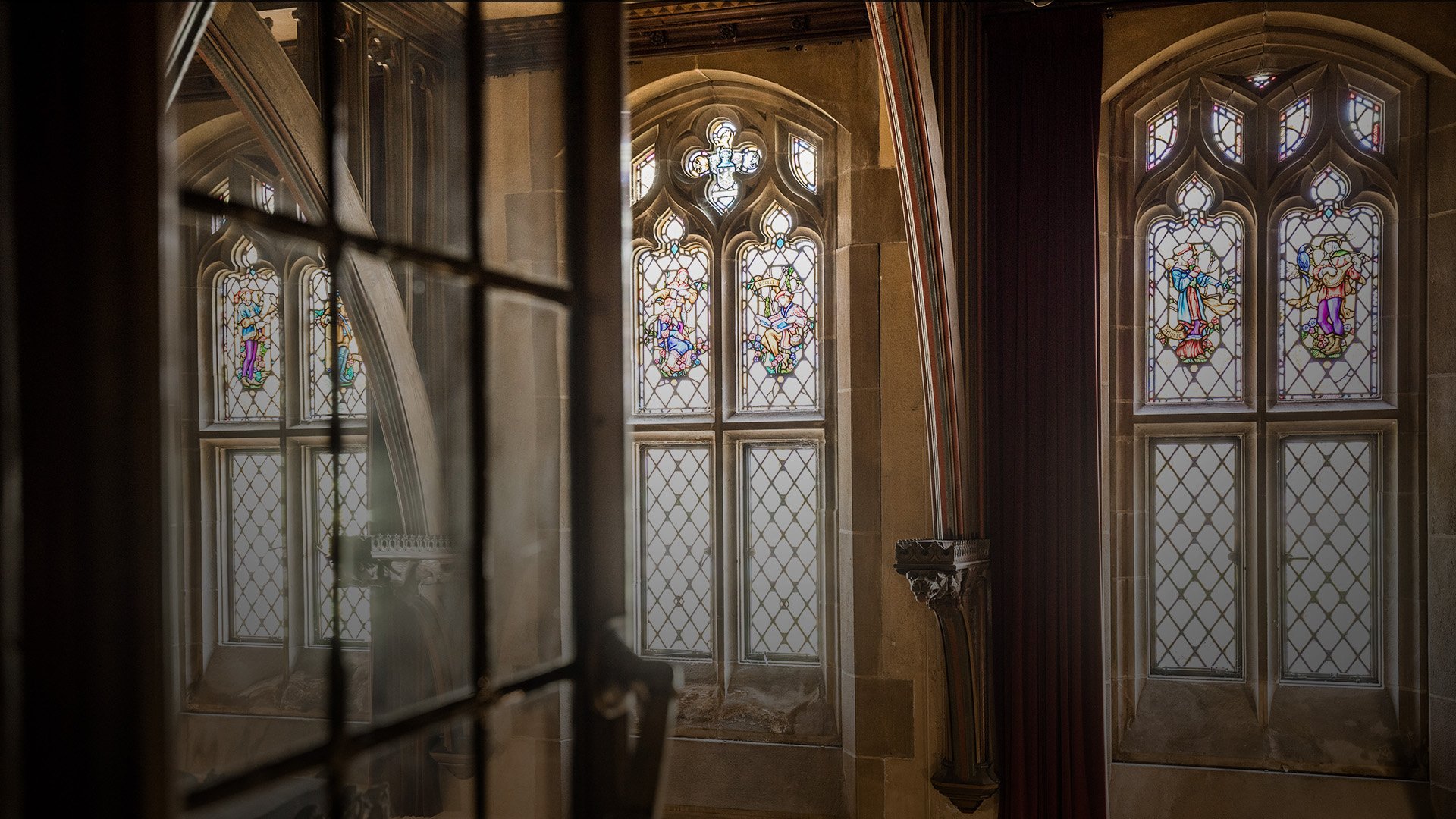 Originally our studio was set up to rebuild six window areas in the …mansion’s two-story Gothic-inspired Ballroom.[1] The stained glass windows, almost a century old now, were original to the building, opened in 1929.[2] In early February 2025, we received news that two of the windows to be restored had been vandalized and demolished. Luckily, we had taken reference photos the week before, as we awaited the final go-ahead.