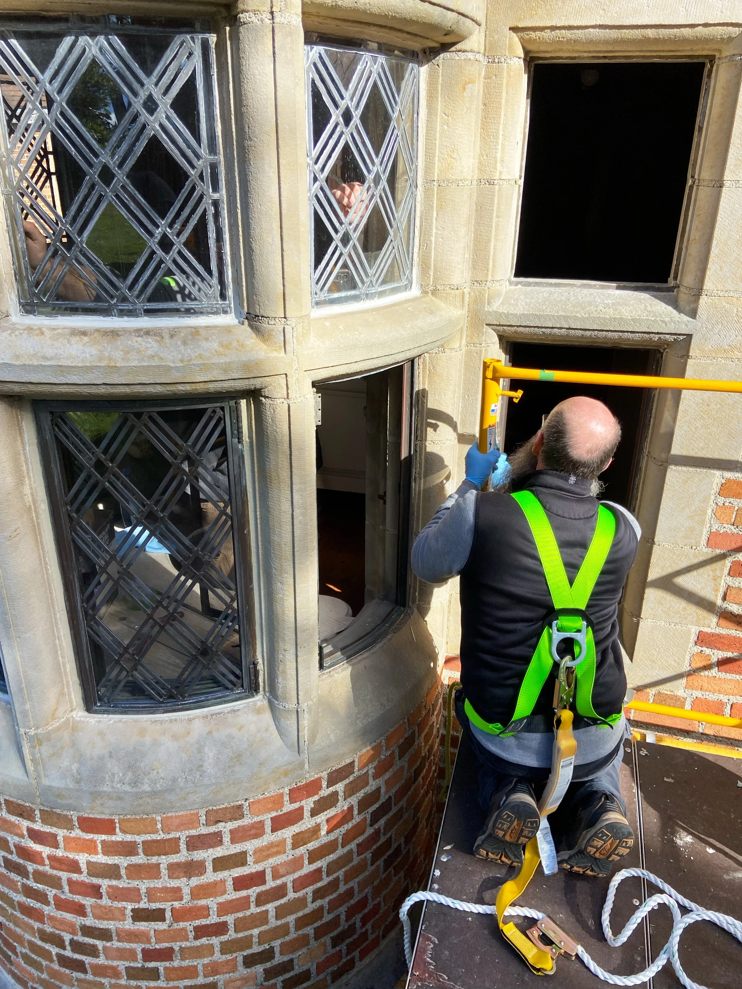 Restoration of windows in Frances’ bedroom suite posed a unique challenge as the room looks out from the second floor of a curved set of bay windows. To restore these windows our team had to rebuild on a curved form and install with scaffolding.