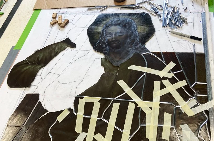 From St. Francis Xavier’s project page the story goes like this: In the late winter of 2023, after Mass one Sunday, a concerned and observant parishioner approached Deacon Paul with a surprising message: “Jesus is moving.” Unsure of what she meant, he asked for clarification. She pointed to the large Ascension window near the organ on the south side of the church, where — with each gust of wind — the stained glass seemed to pulse in and out. It turned out she was right: Jesus was moving. Upon closer inspection, it became clear that the retaining bar above Jesus’ head and the lead seam along his left side had broken. A portion of the window was dangerously close to detaching. Our maintenance crew acted quickly to secure a temporary fix, and a stained glass restoration company, Omnibus Studios, was brought in to assess the damage. [1]