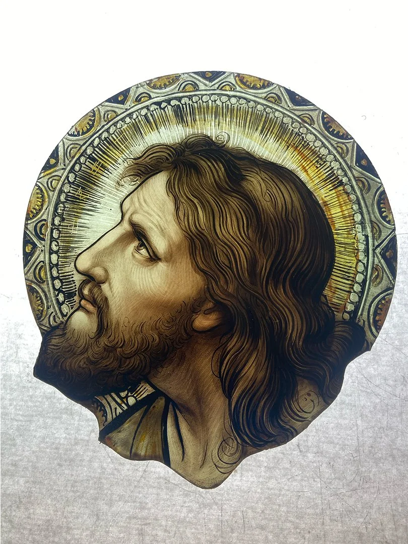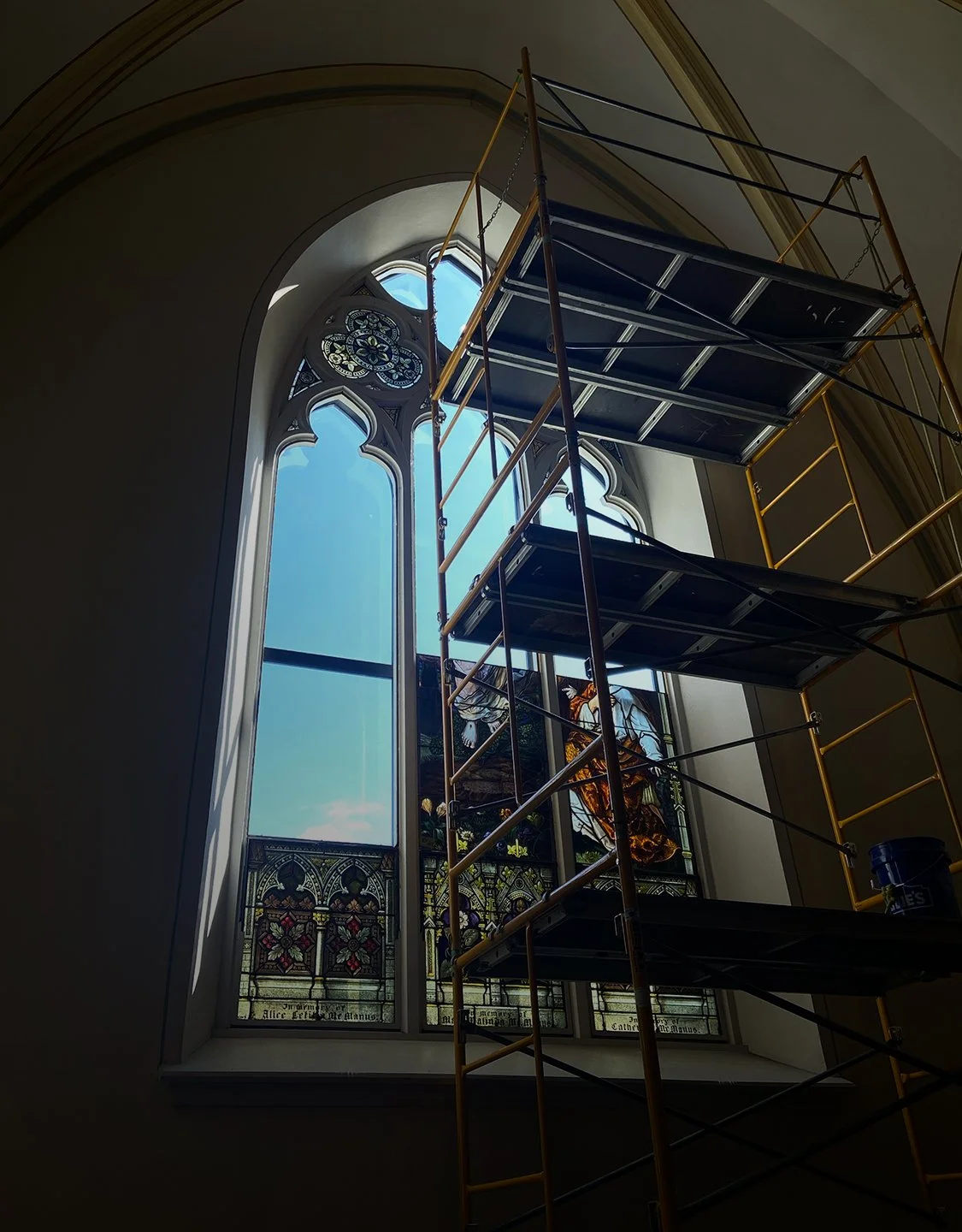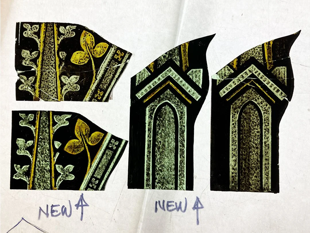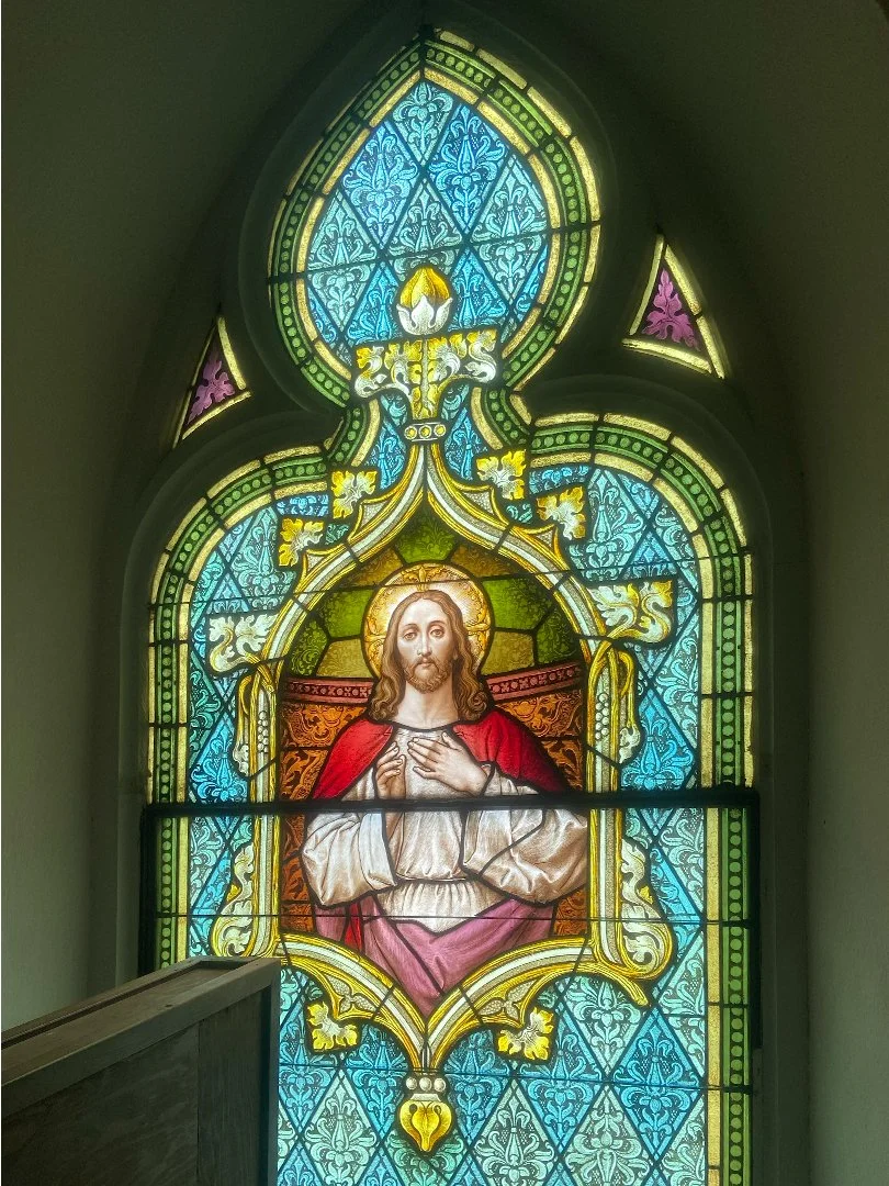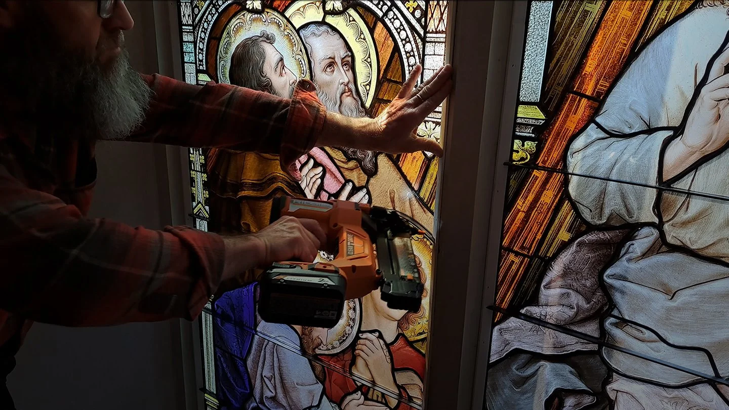 While we were assessing the windows in the studio it was discovered that the church for some period of time was likely heated with coal and the windows had soot all over them. As you can imagine, this diminishes the vibrance and the amount of light that can pass through the glass. We polished and cleaned these babies up, restoring them to their former glory.